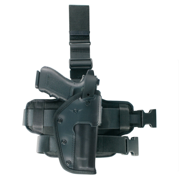 Fondina Tactical professionale realizzata in Tritech (trilaminato termoformato) che assicura ottime performance di sicurezza, praticità e resistenza in ogni condizione d’uso. Completa di supporto cosciale a pera, foderato internamente in gomma antiscivolo e nastro di ancoraggio alla coscia regolabile con Velcro, sul quale è possibile applicare numerosi accessori quali portacaricatori aggiuntivi.